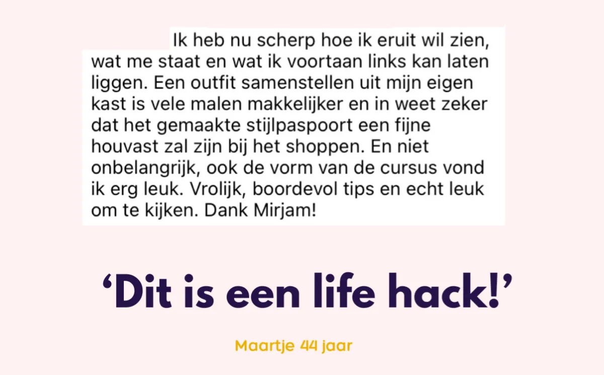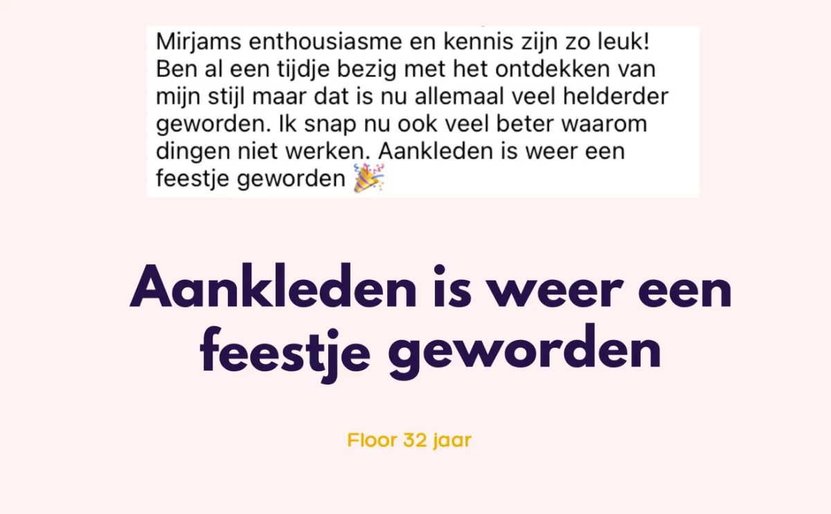 Hey, ik ben Mirjam! 8 jaar geleden begon ik als stijlcoach. Niet omdat ik zelf alles perfect voor elkaar had. Maar omdat ik zag hoeveel vrouwen worstelen met hetzelfde probleem: Een volle kledingkast, maar toch het gevoel: "Ik heb niets om aan te trekken".